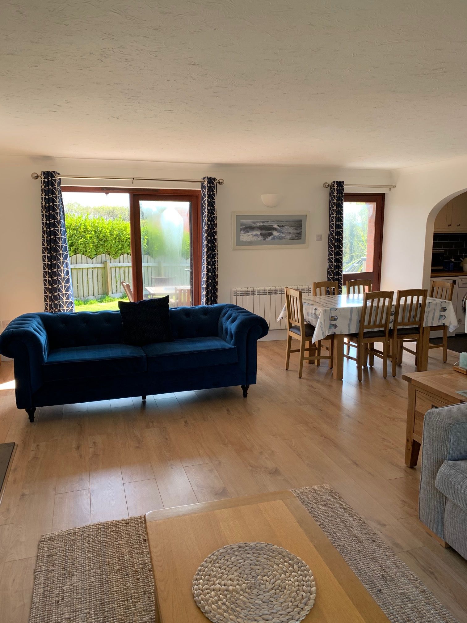 Large open plan design.Seating for 6 people on comfortable sofas overlooking lovely gardens with access via patio doors. Dining table and chairs. Wood burning stove for those cooler evenings.